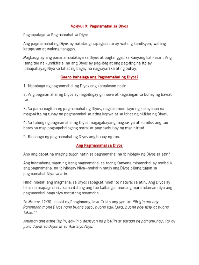 Higit na mahalaga ang kakayahang magmahal ng tao kaysa sa kaniyang kakayahang magsilang ng sanggol dahil ito ang nagpapadakila sa kaniya. Isang mahalagang konsepto na iyong nalaman tungkol sa pagkakaiba ng tao ng hayop sa Modyul 1 ay ang kaalamang ikaw bilang tao ay nilikhang hindi tapos di tulad sa hayop. Ano ang ibig sabihin ng pagsunod sa Diyos at kung paano ang pagsunod sa Diyos ay isang paksang inaalala ng maraming mga mananampalataya sapagkat nagsasangkot ito ng mahalagang bagay sa kung makakamit natin ang pagsang-ayon ng Diyos at makapasok sa kaharian ng langit sa ating paniniwala sa Diyos.