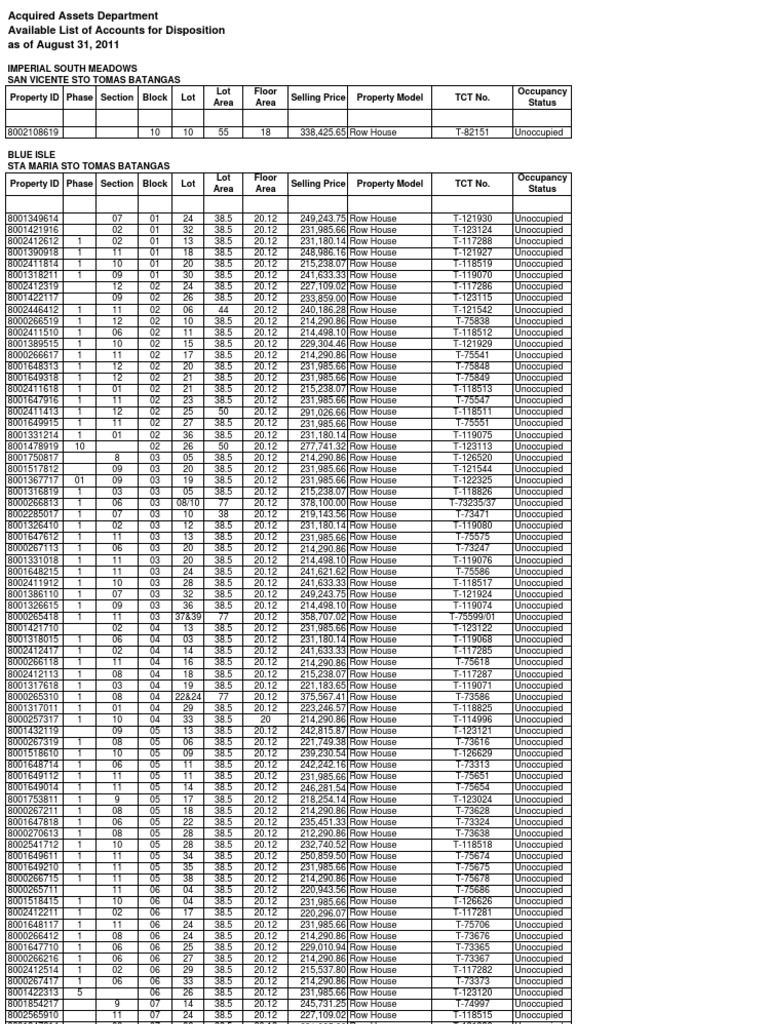 Hdmf Or Pag Ibig Final List Of Acquired Assets As Of August 31 2011 Unoccupied Settlement Geography Urbanization